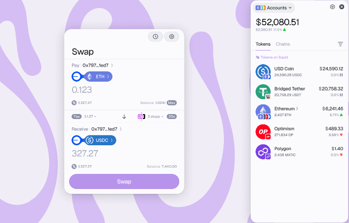 See your aggregated balances across EVM and Cosmos for the first time and seamlessly interact with the Squid app from your Wallet View. Set your source and destination assets, pin your favorite tokens, and swap within seconds, all from one place.