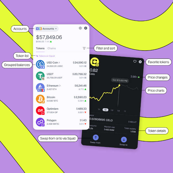 One place to view and manage all of your crypto across chains, accounts, and wallets. It’s the cross-chain portfolio of your dreams, and so much more. Discover tokens you forgot you had and swap directly from the charts.