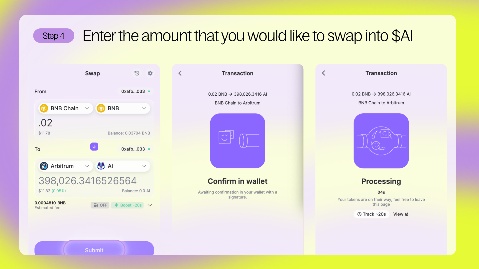 Step 4 - Enter the amount of BNB that you would like to swap into AI on Arbitrum. Review your order and click ‘Submit.’ Make sure to approve in your wallet too, if prompted. You will see a ‘Processing’ message followed by ‘Complete.’ Congratulations, you now have AI on Arbitrum!