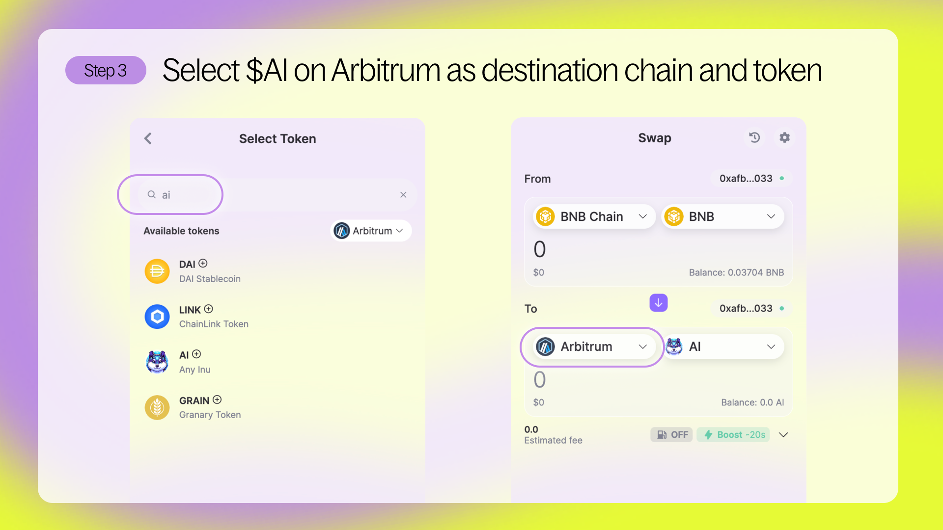 Step 3 - Select preferred destination chain and the preferred Interchain Token as the destination token. For this exampled we’ll be using $AI as the preferred Interchain Token token, and Arbitrum as the preferred destination chain.
