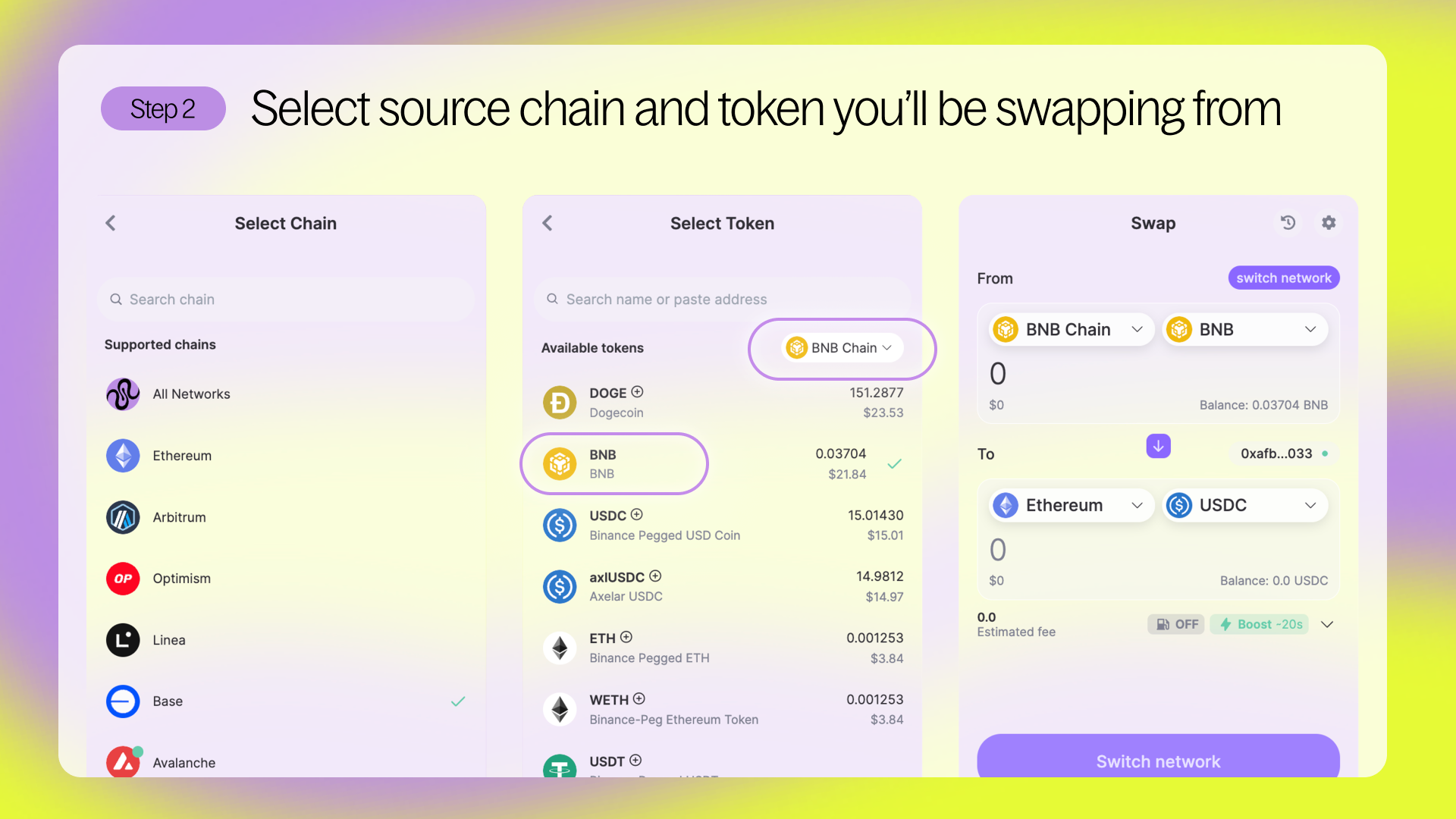 Step 2 - Select source chain and token you’ll be swapping from. For this example we’ll be using BNB on the BNB Chain as the source token and chain.