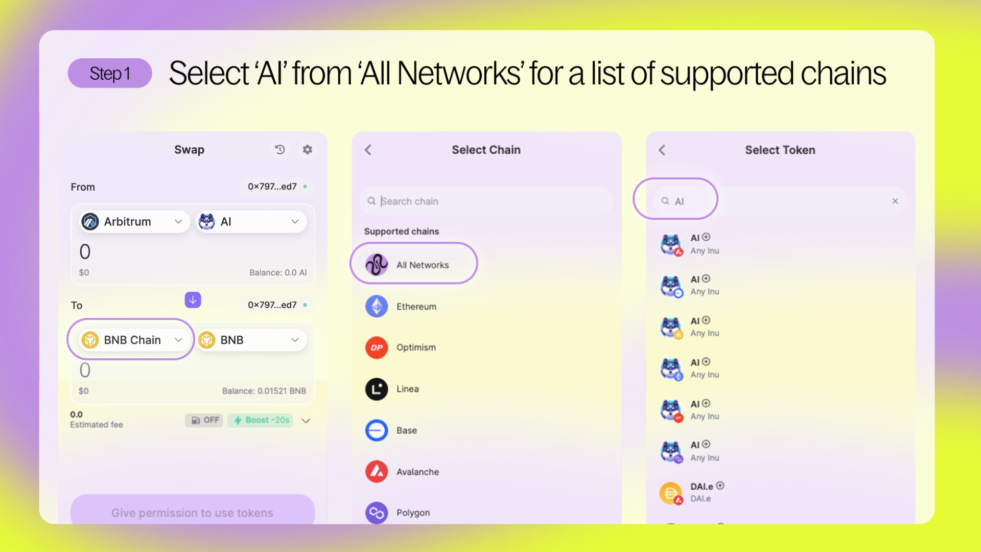 Step 1 - Now that you have AI on an ITS supported chain, you can move AI between and across all other supported ITS chains as you want. Select ‘AI’ from ‘All Networks’ for a complete list of supported chains.