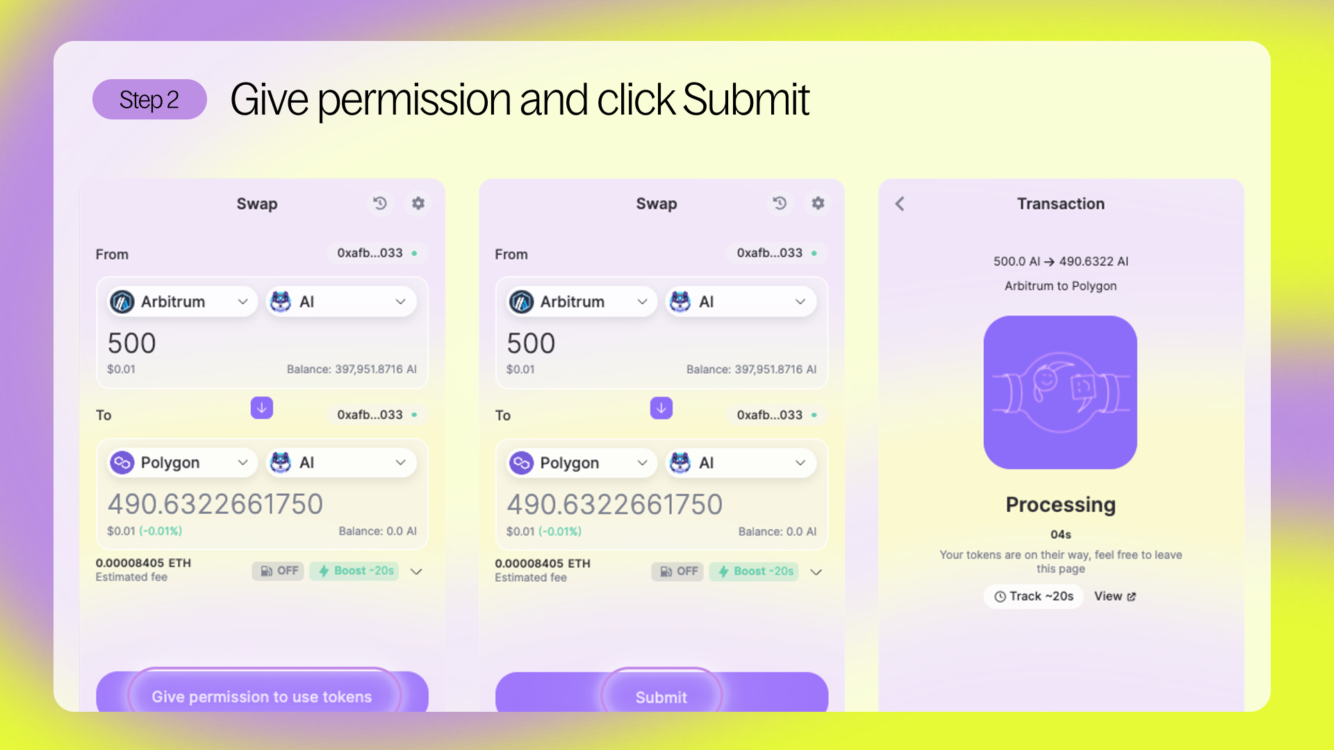 Step 2 - For this example, we’ll be sending AI from Arbitrum to Polygon. Be sure to give permission and confirm in wallet if prompted.