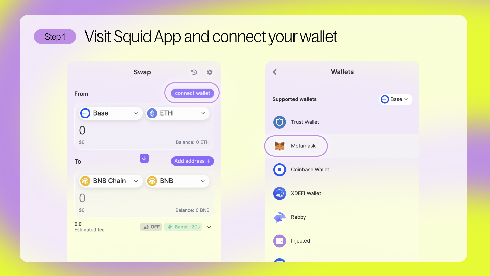 Step 1 - Visit v2.app.squidrouter.com and connect your wallet.