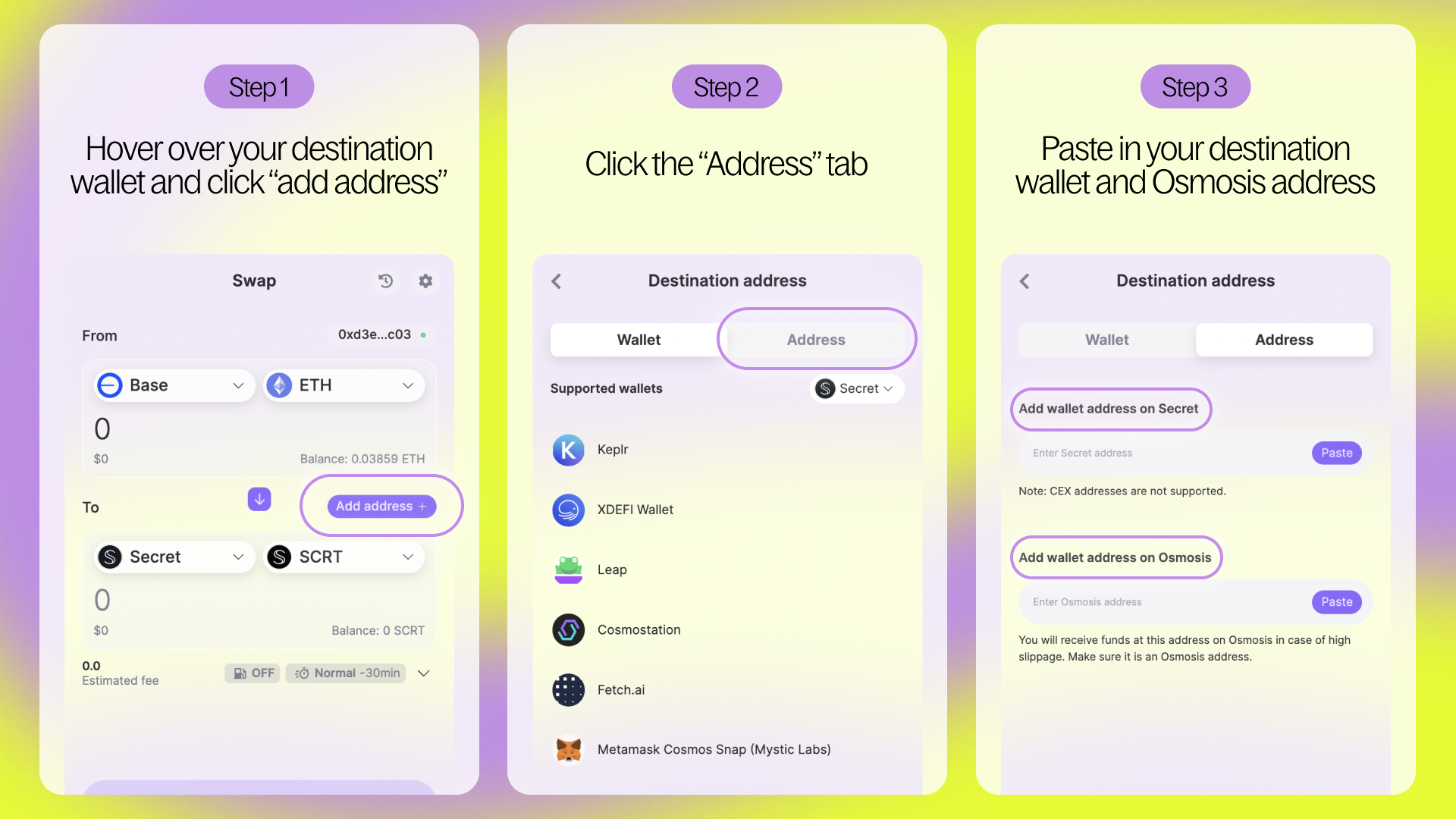 This is because all swaps directed to Cosmos are channeled through Osmosis. Consequently, we need an Osmosis address to handle any potential reversals of the swap, in addition to the initially chosen destination address.