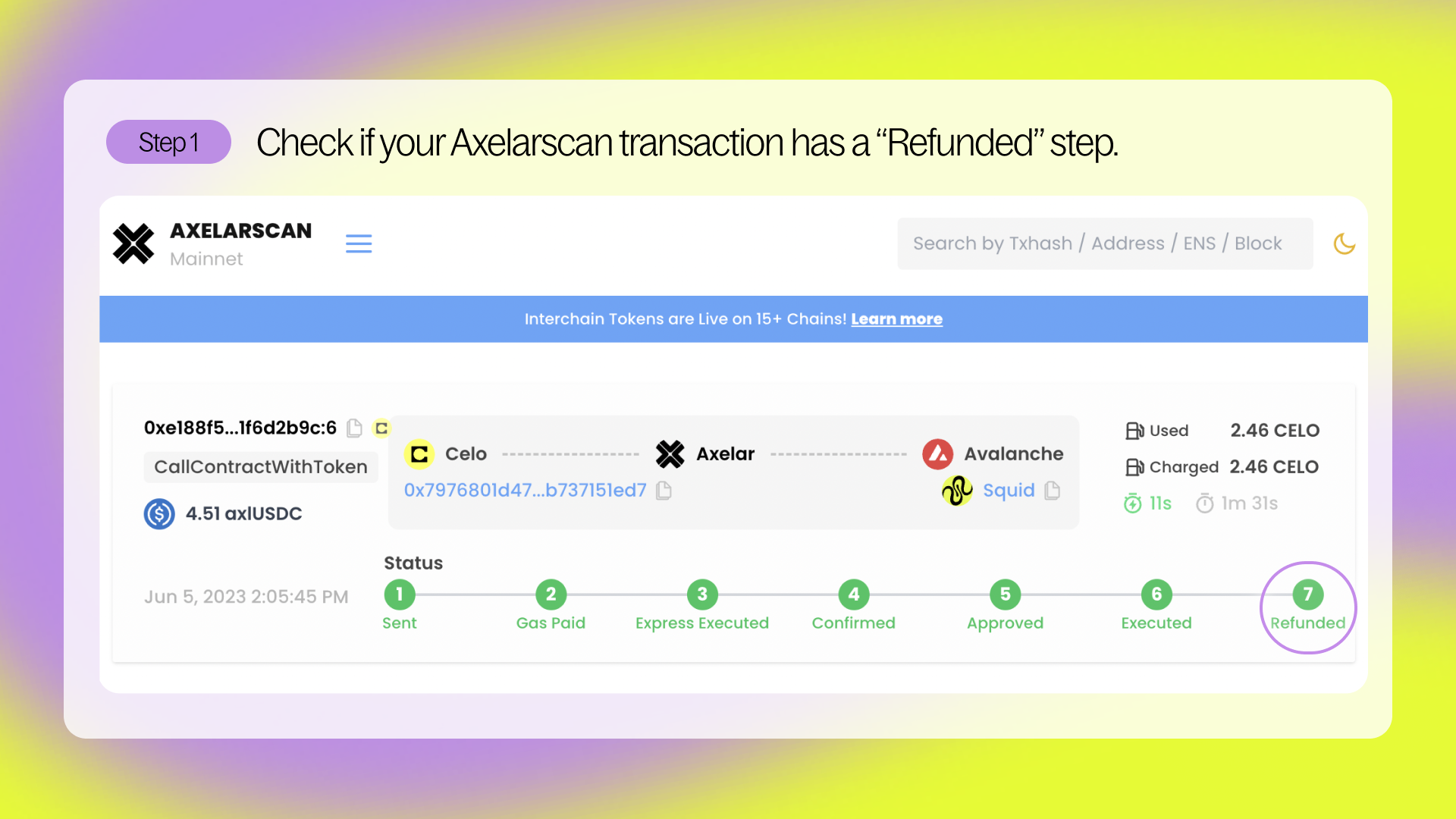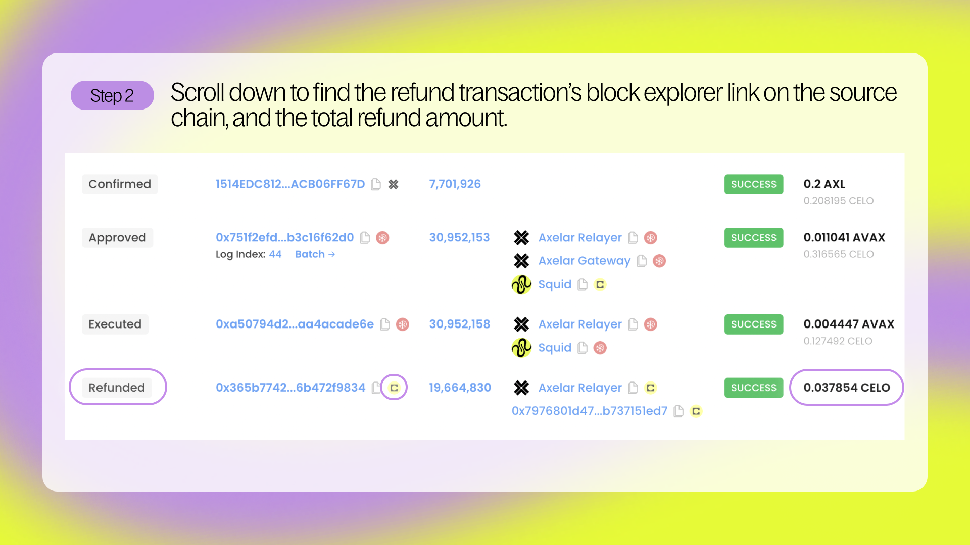 Scroll down on Axelarscan to find the refund's transaction link on the source chain's block explorer, in addition to the total refund amount.